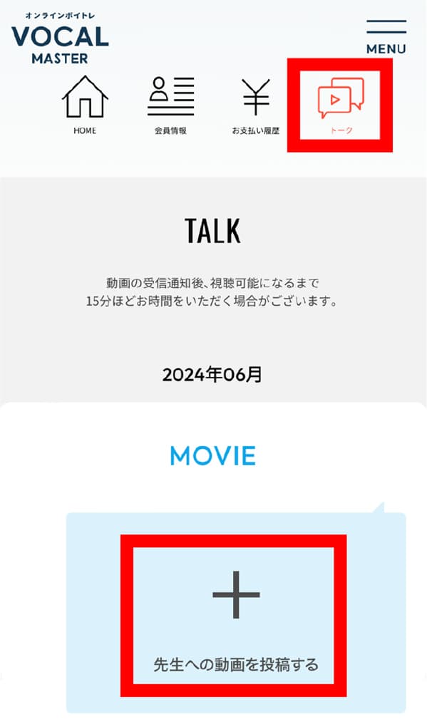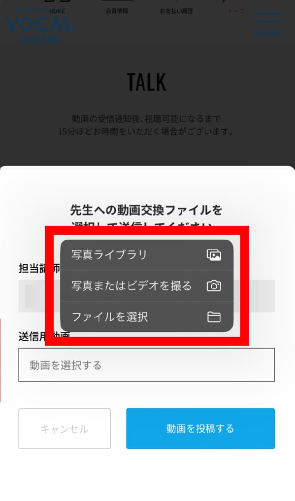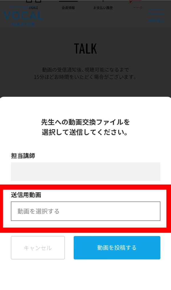 「トーク」の画面を開いて講師からの動画に、ご自身の歌唱動画を添付してご返信ください。
